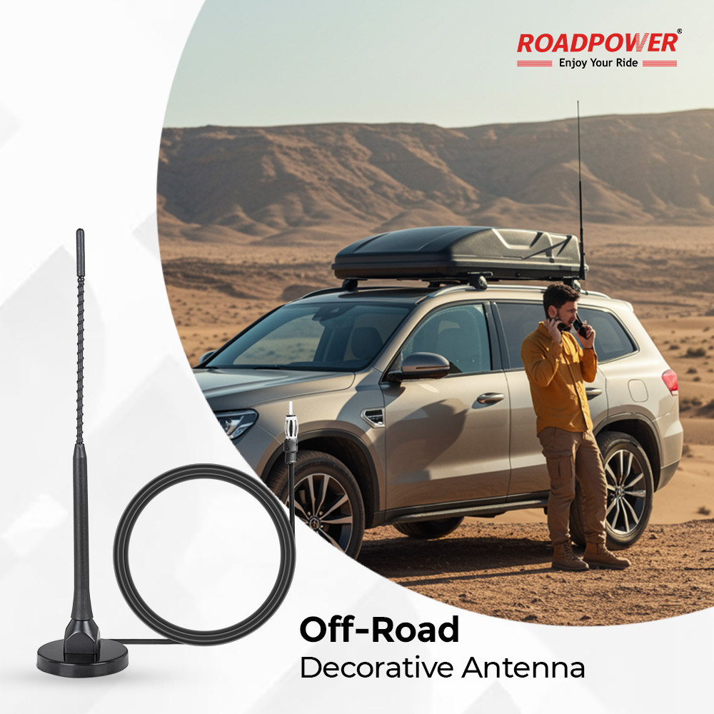 The ROADPOWER Off-Road Decorative Antenna combines rugged design with reliable performance, perfect for outdoor and adventure vehicles. Built with a durable, flexible mast and a strong magnetic base, it ensures stability even on rough terrain. The long cable provides easy installation and secure connectivity. Designed to complement any SUV or off-road vehicle, this antenna delivers both style and practicality helping you stay connected.