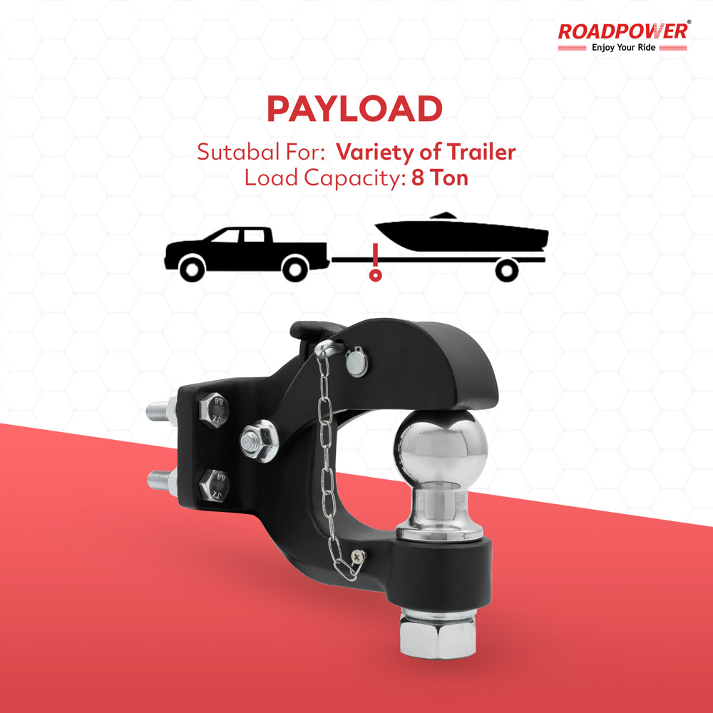 Tackle massive loads with the ROADPOWER heavy-duty hitch assembly! Featuring an impressive 8-ton load capacity, this system is built for the toughest trailer towing jobs. The robust black housing securely clamps around the heavy-duty ball mount, while the auto-locking mechanism and safety chain ensure a dependable, rattle-free connection. Perfect for trucks and large SUVs needing serious towing muscle.