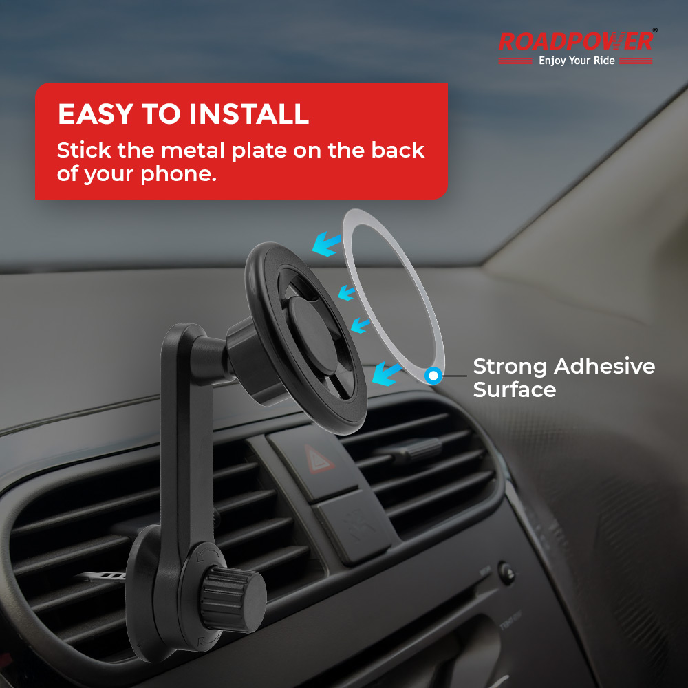 Get easy, one-touch access to your phone with the ROADPOWER Magnetic Holder. Installation is simple: stick the included metal plate onto your phone or case, and it instantly snaps to the strong magnetic surface. This mount uses a secure adhesive base to grip your air vent firmly, keeping your device steady. Enjoy a reliable, frustration-free solution for hands-free driving and navigation. Enjoy your ride safely.