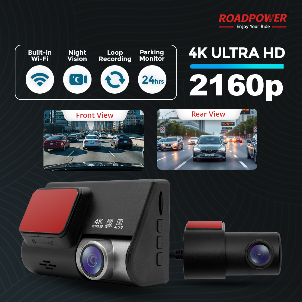 Capture every moment on the road with the ROADPOWER DASH-840 4K Dual Dash Cam, your reliable driving companion for safety and peace of mind. Designed for clarity, durability, and ease of use, this dual-camera system records both the front and rear views of your vehicle, ensuring complete coverage in every drive. The 4K Ultra HD front camera captures stunning, crystal-clear footage of your journey, while the waterproof rear camera provides dependable recording even in harsh weather.