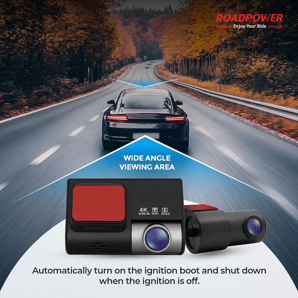 The RoadPower Dash Cam offers a wide-angle viewing area for maximum road coverage, ensuring every detail is captured in stunning 4K Ultra HD resolution. With built-in WiFi and ADAS support, it enhances driving safety and convenience. The camera automatically powers on with the ignition and shuts down when the vehicle is turned off, making it effortless to use. Perfect for capturing clear, reliable footage on every ride.