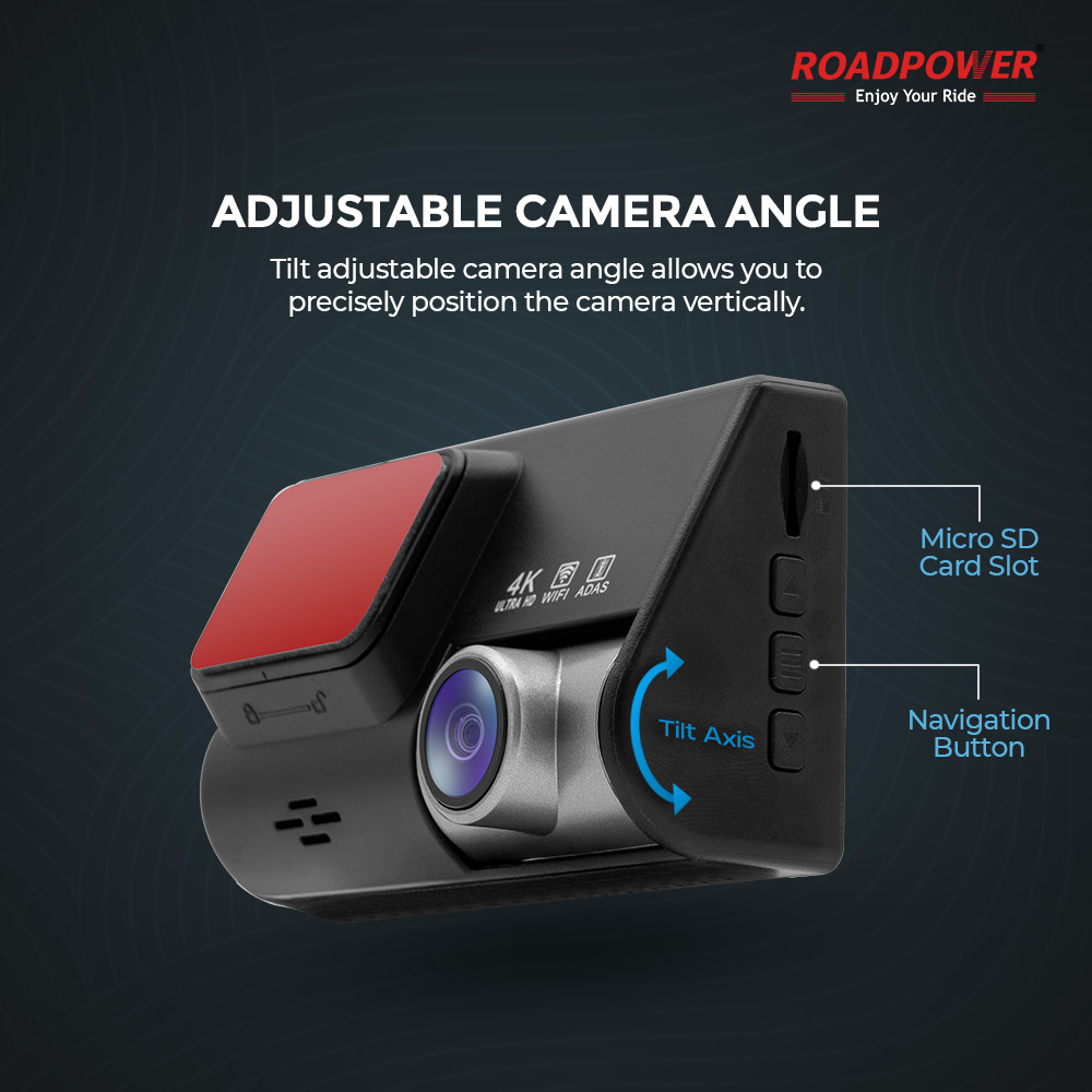 The ROADPOWER RP-DASH-840 features an adjustable camera angle, allowing precise vertical positioning for optimal road coverage. Equipped with 4K Ultra HD resolution, WiFi, and ADAS technology, it ensures crystal-clear footage and enhanced driving safety. The design includes a convenient Micro SD card slot and easy-access navigation buttons. Perfect for front and rear monitoring, this dash cam offers superior clarity, flexibility, and performance for every drive.