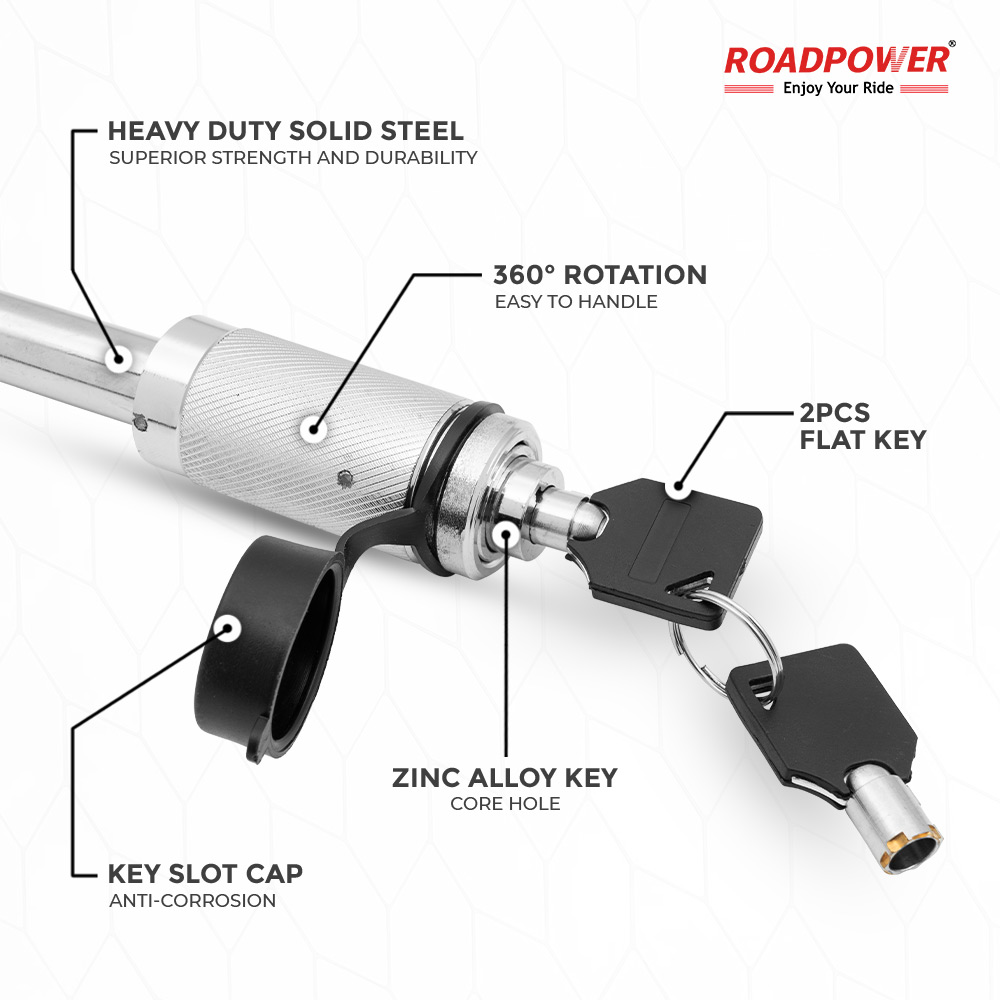 Secure your trailer with the ROADPOWER hitch lock. Made from heavy-duty solid steel for superior strength and durability, this lock is built to last. The user-friendly 360° rotating head makes it easy to handle, while the anti-corrosion key slot cap protects the zinc alloy core from the elements. This reliable lock comes with two flat keys, providing ultimate security and peace of mind for your towing setup.