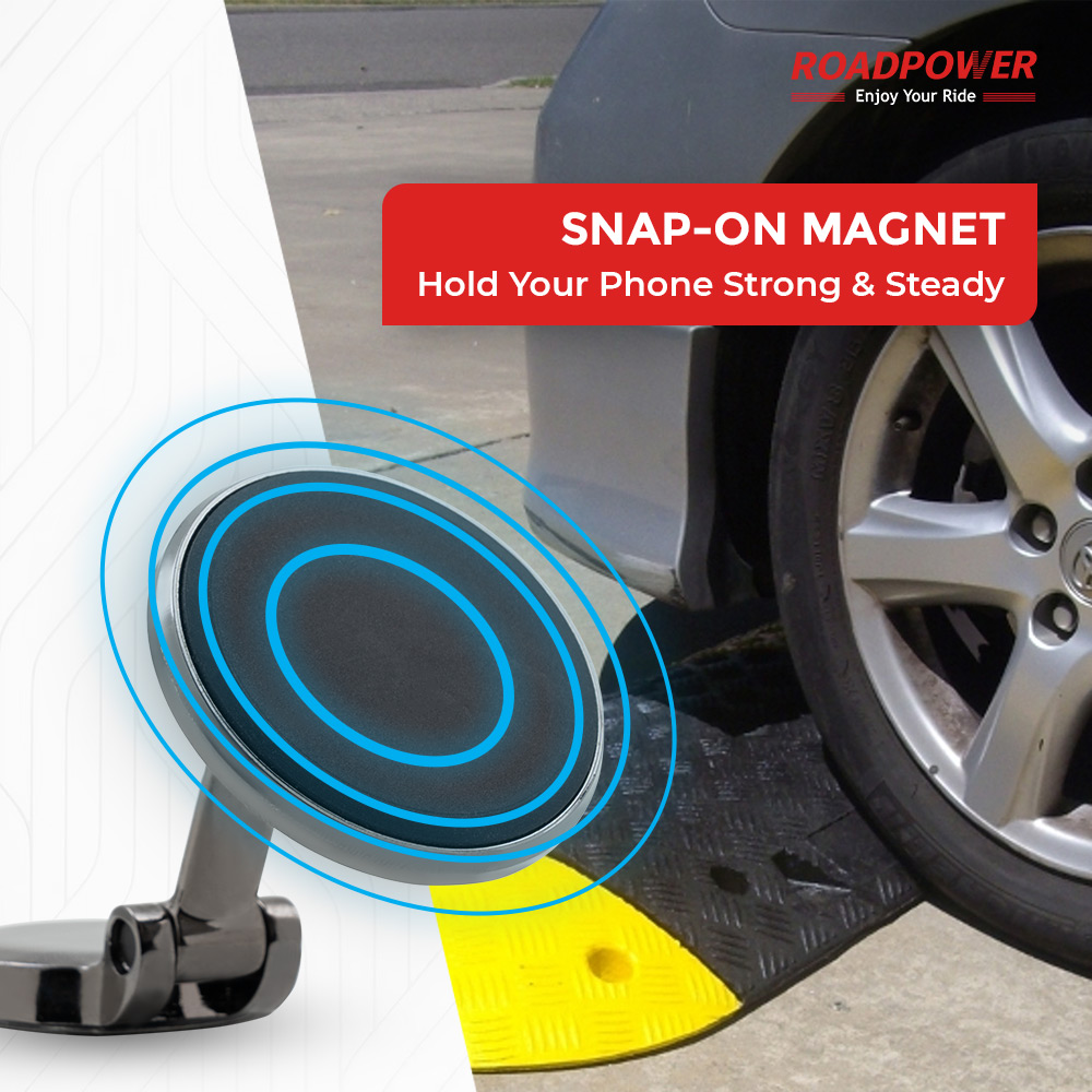 Experience unmatched stability with the ROADPOWER Snap-On Magnetic Phone Holder. Its powerful magnet holds your phone strong and steady, proven even when navigating rough ground or speed bumps. Installation is instant simply attach the included metal plate to your device. This mount keeps your phone locked in place for safe, hands-free navigation and calls, ensuring you can focus entirely on the road ahead. Enjoy your ride with ultimate convenience.