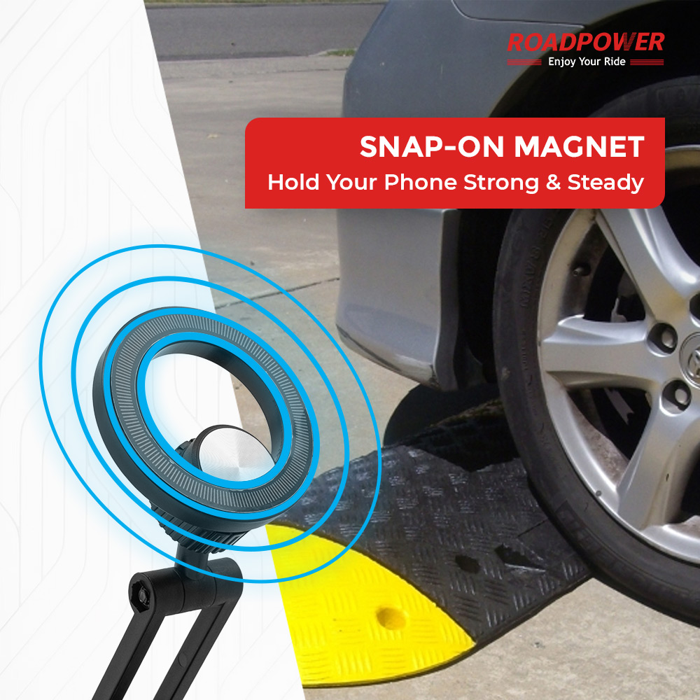 Experience unparalleled security with the ROADPOWER Snap-On Magnet car mount. Designed to hold your phone strong and steady, this magnetic system grips your device even when driving over obstacles. Installation is simple: stick the metal plate to your phone, and the powerful magnet ensures a reliable, one-touch attachment. Keep your navigation safe and accessible with this durable mount, letting you focus on the road ahead.
