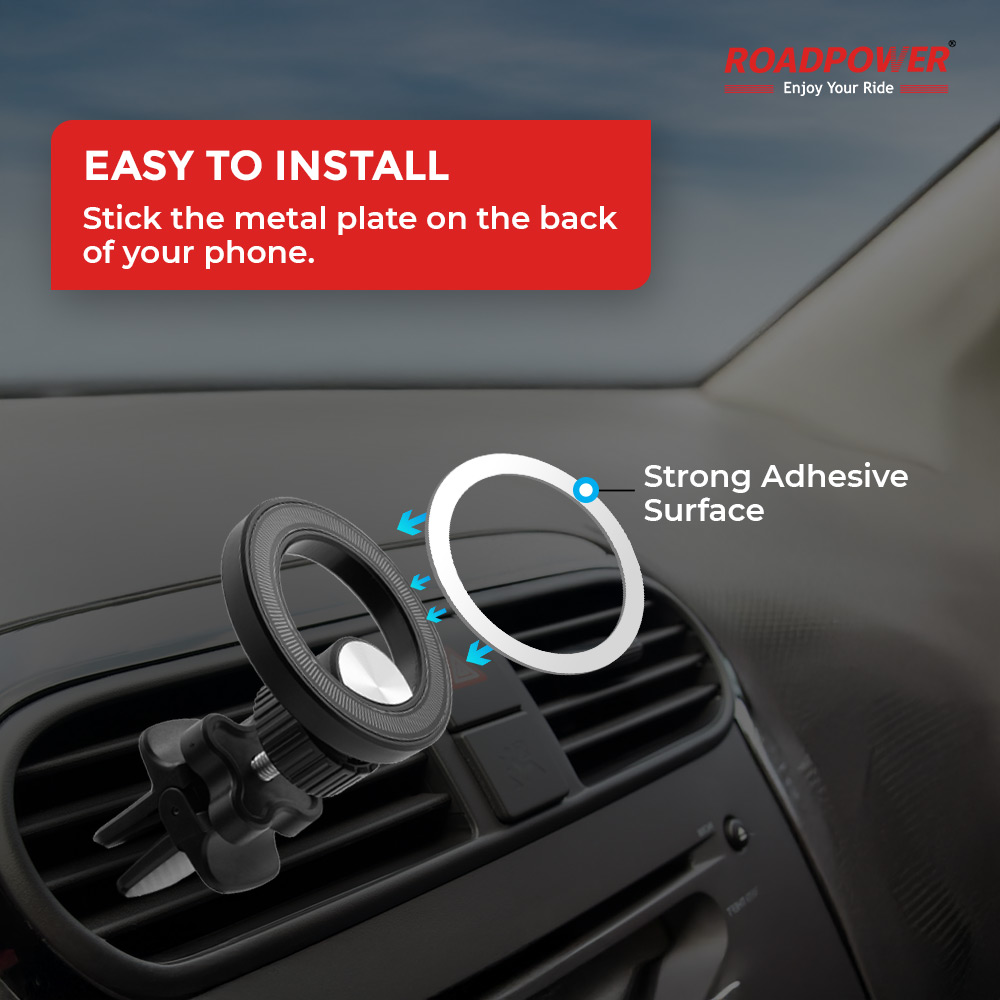 Get instant, secure phone mounting with this ROADPOWER magnetic holder. Installation is simple and quick: just stick the included metal plate onto the back of your phone or case. The mount secures firmly to your dashboard via a strong adhesive base. This design allows for immediate, one-handed snap-on use, keeping your device steady and safely accessible while you drive. Enjoy convenient operation and a reliable hold on the road.