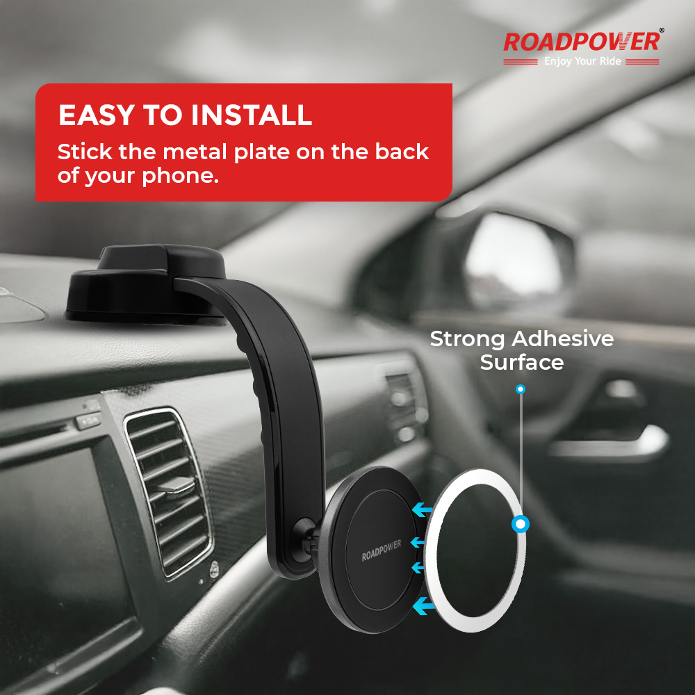 The ROADPOWER magnetic mount holds a phone without clamps. The package contains a flat metal plate – the user peels the backing and presses the plate to the phone case. A magnet in the mount grips the plate. The mount sits on a hinged arm that extends and tilts. The base locks to the dashboard through a suction cup. The phone stays in place while the driver views maps or takes calls.