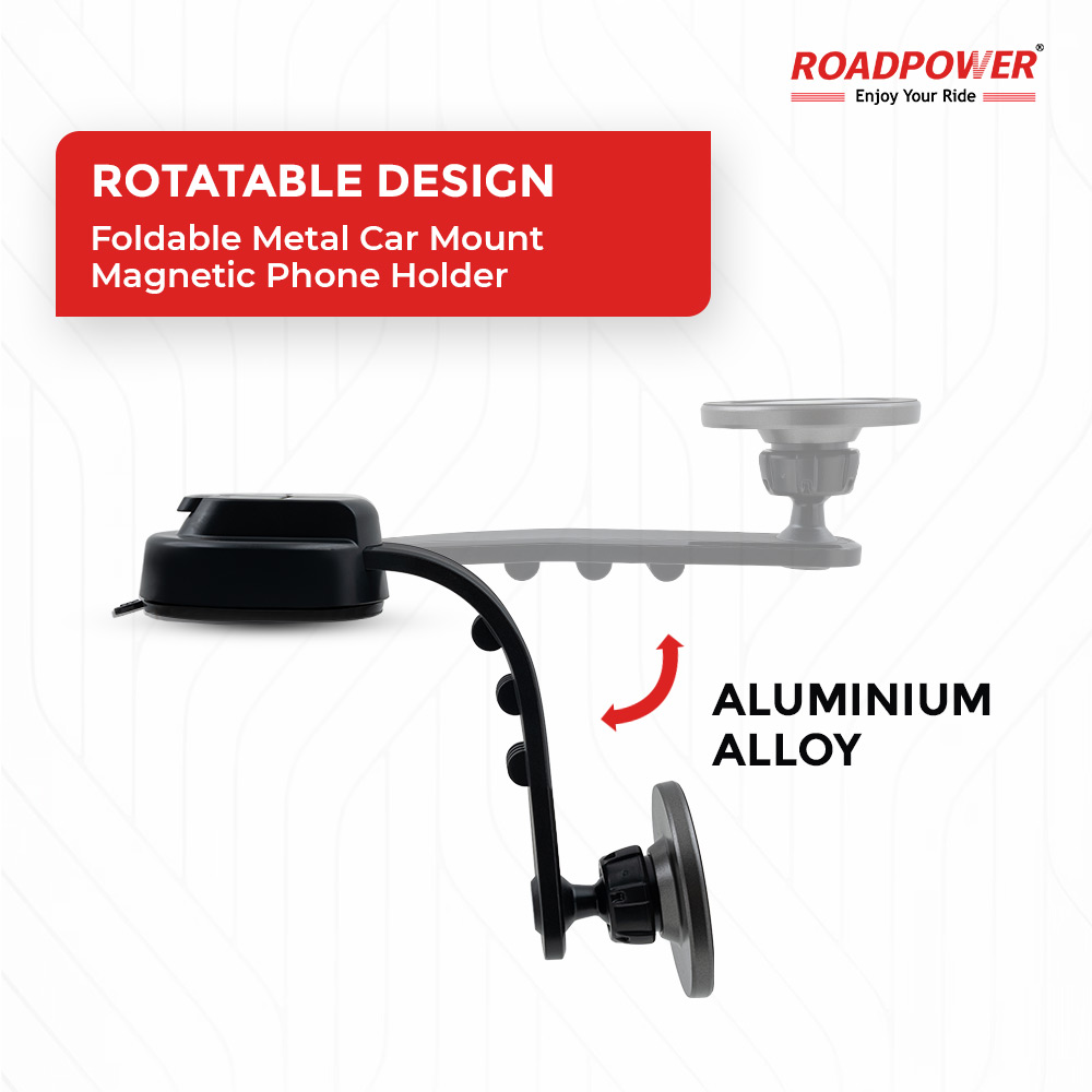 The ROADPOWER Foldable Magnetic Phone Holder lets you set the exact angle you want. The body is built from aluminum alloy it resists wear and stays rigid. A telescopic arm extends plus retracts and the magnetic head tilts but also turns without tools. You secure or release the phone with one hand your eyes stay on the road. The base folds flat when you store it and it opens again in seconds for the next trip.