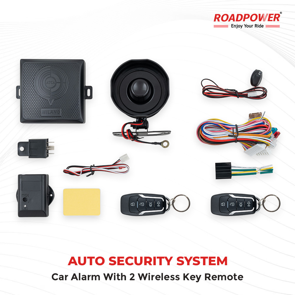 The ROADPOWER Milano Auto car alarm System offers reliable protection for your vehicle with a complete kit, it includes a main control unit, loud siren, advanced wiring harness, relay, and two wireless remote keys for convenient operation. Designed for durability and performance, this system provides enhanced anti-theft security and peace of mind, ensuring your car stays safe.
