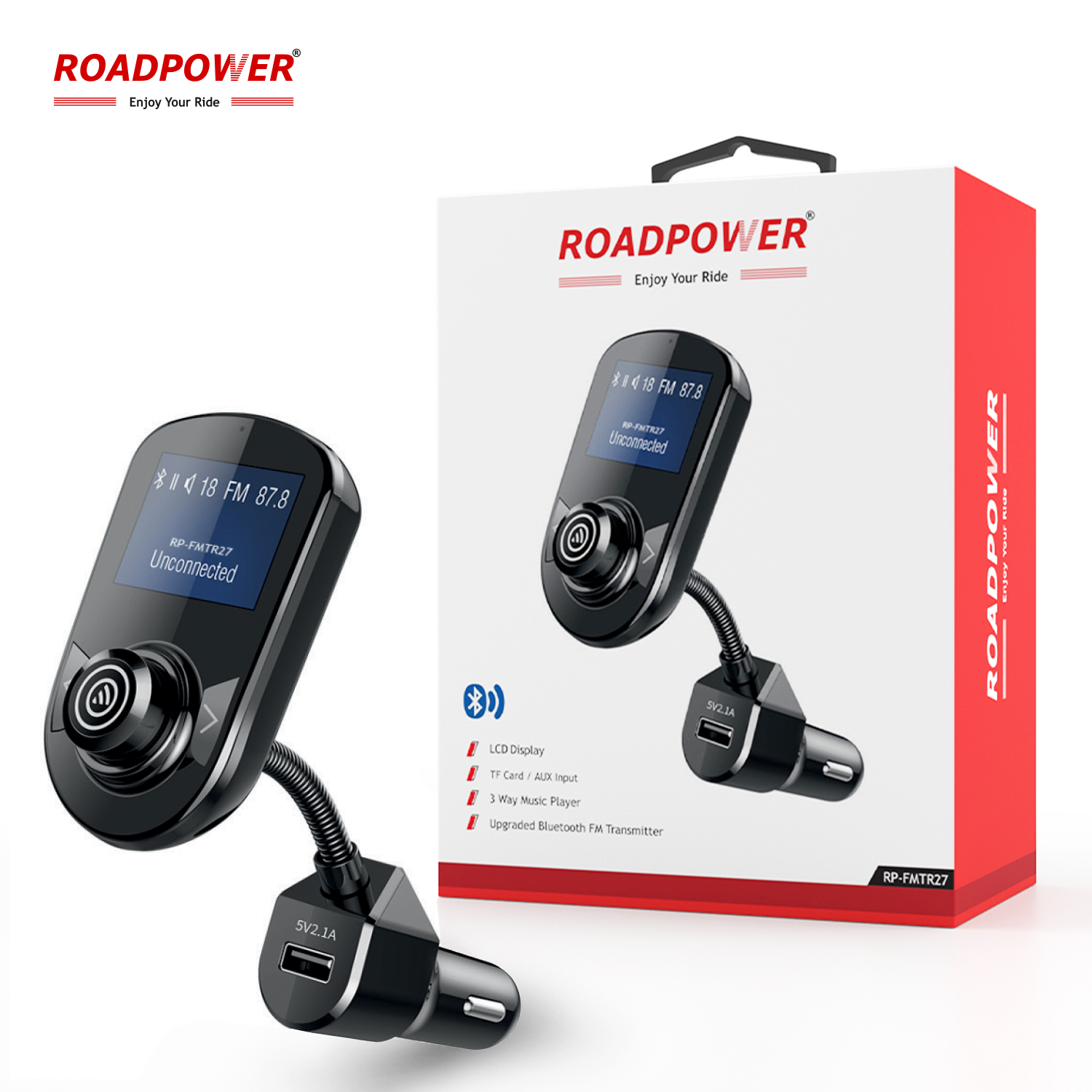 Upgrade your in-car entertainment with the versatile ROADPOWER Bluetooth FM Transmitter. This all-in-one gadget lets you stream audio wirelessly or play music directly from a Micro SD card or AUX-connected device. A clear LCD display shows the FM frequency and connection status, while the flexible neck allows for perfect positioning. Keep your devices powered up with the integrated 5V/2.1A USB fast charge port, making it the perfect companion for any journey.